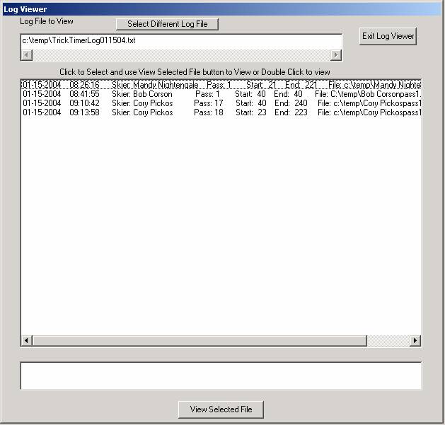 Each time a trick run is captured and processed through the timing screen, that information is recorded in this log. You can view any run or retime the run by selecting the desired run and then clicking the View button (or double-clicking the file) which will take you to the Timer Screen with the selected file loaded.