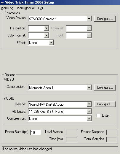 The most important items to select here are the resolution which probably should be 320x240, the compression method (Microsoft 1 or Indeo) and the frame rate.